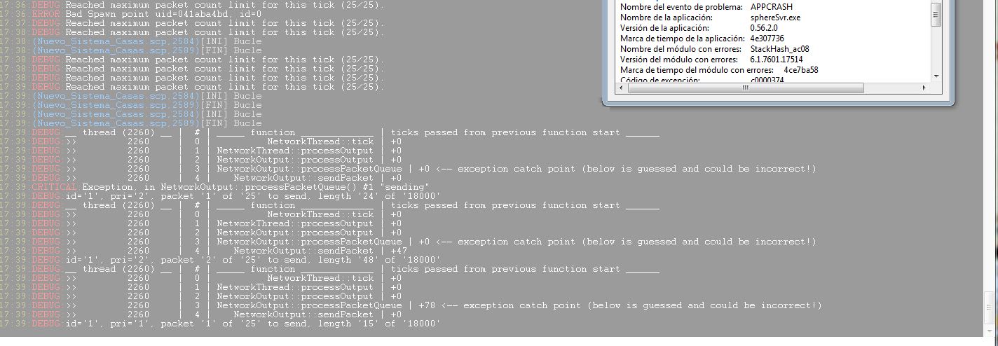 Client used 7.0.8.2 What you put in NetworkThreads?. 0 perhaps? I'm still having problems with unknown packets if NetworkThreads is greater than 0. Moreover, without touching anything else in the sphere.ini from a previous version 0001484 and the current put what you put in NetworkThreads always returns the next line. In the end, I chose to raise the value MaxPacketsPerTick and MaxSizePerTick. But previous versions have not had to touch it in months. 12:32:DEBUG:Reached maximum packet count limit for this tick (100/100). 12:32:DEBUG:Reached maximum packet count limit for this tick (100/100). 12:32:DEBUG:Reached maximum packet count limit for this tick (100/100). 12:32:DEBUG:Reached maximum packet count limit for this tick (100/100). 12:32:DEBUG:Reached maximum packet count limit for this tick (100/100). 12:33:WARNING:12:Unknown game packet (0x7b) received. 12:33:DEBUG:12:Game packet (0x0) does not match the expected length, waiting for more data... 12:33:DEBUG:12:Game packet (0x0) does not match the expected length, waiting for more data... 12:33:DEBUG:12:Game packet (0x0) does not match the expected length, waiting for more data... 12:33:DEBUG:12:Game packet (0x0) does not match the expected length, waiting for more data... 12:33:DEBUG:12:Game packet (0x0) does not match the expected length, waiting for more data... 12:33:DEBUG:12:Game packet (0x0) does not match the expected length, waiting for more data... 12:33:DEBUG:12:Game packet (0x0) does not match the expected length, waiting for more data... 12:33:DEBUG:12:Game packet (0x0) does not match the expected length, waiting for more data... 12:33:DEBUG:12:Game packet (0x0) does not match the expected length, waiting for more data... 12:33:DEBUG:12:Game packet (0x0) does not match the expected length, waiting for more data... 12:33:DEBUG:12:Game packet (0x0) does not match the expected length, waiting for more data... Or 12:52:DEBUG:Reached maximum packet length limit for this tick (30022/30000). 12:52:DEBUG:Reached maximum packet length limit for this tick (30022/30000). 12:52:DEBUG:Reached maximum packet length limit for this tick (30022/30000). |