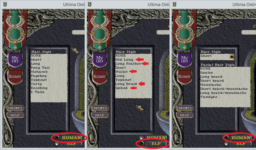 | Additional Information | I checked the names from EA/OSI: http://tessascove.com/guides/vendors/vendor_customize_gump.jpg [^] Also these names are the same from character creation menu (tested on client 5.0.2 ML) as you can see on the uploaded img PS: Elfs doesnt have beards | |||||